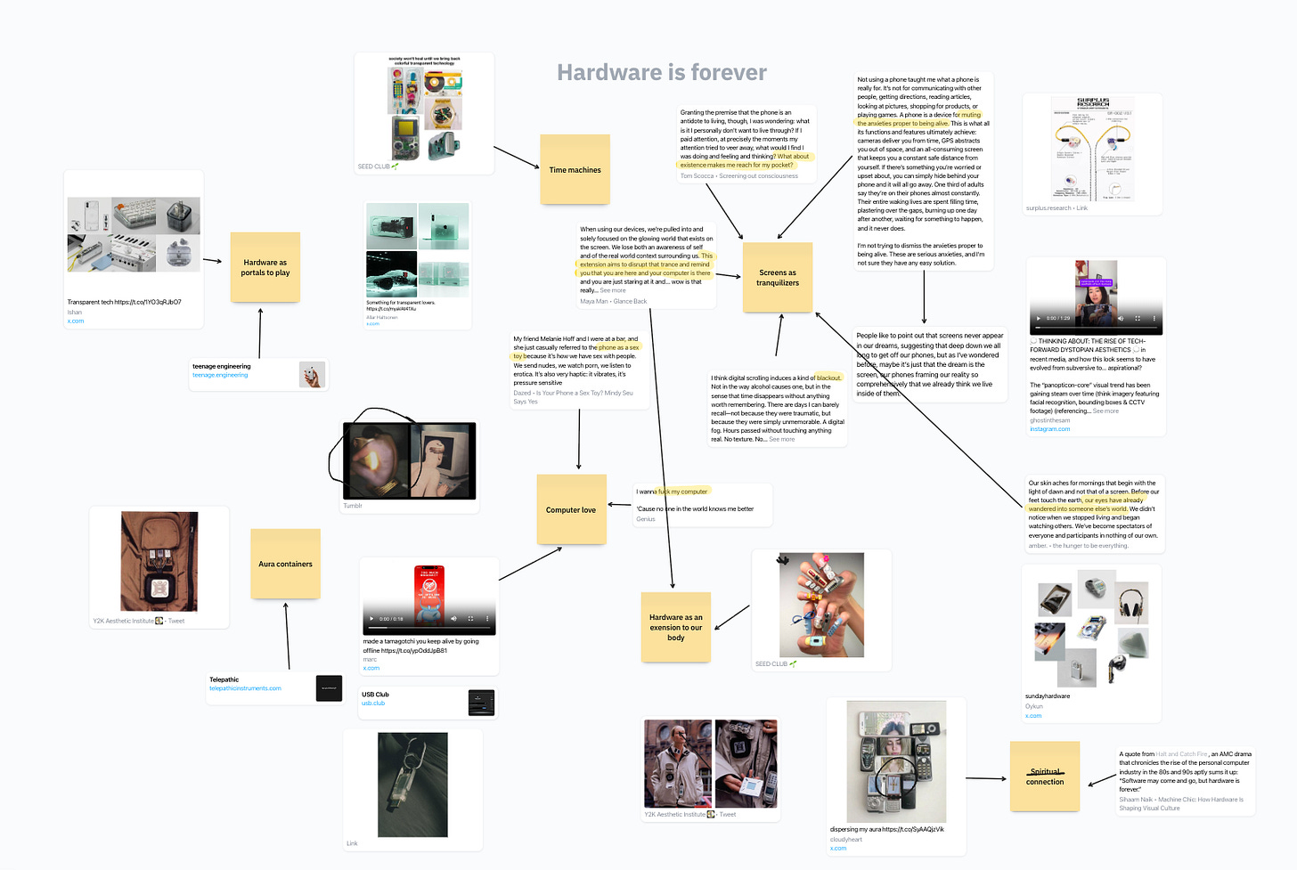 Once I’ve gathered these disparate signals, and go from collecting to connecting, I need to work spatially, using mind-mapping tools. Usually, this is Miro or Figma, but recently it’s mostly happening in Sublime’s Canvas function, where I can automatically create boards that link to my collections. This is what makes Sublime unique compared to other typical bookmarking tools - there’s a seamless bridge between curating information and creating meaning, where I can automatically create boards from my collections, giving me space to draw arrows between information, scribble tangents, and cluster research. This way, I can make far more interesting connections and create coherent meaning from all the noise. It syncs up new cards added to the collection, so you can keep coming back to the board as the research grows.